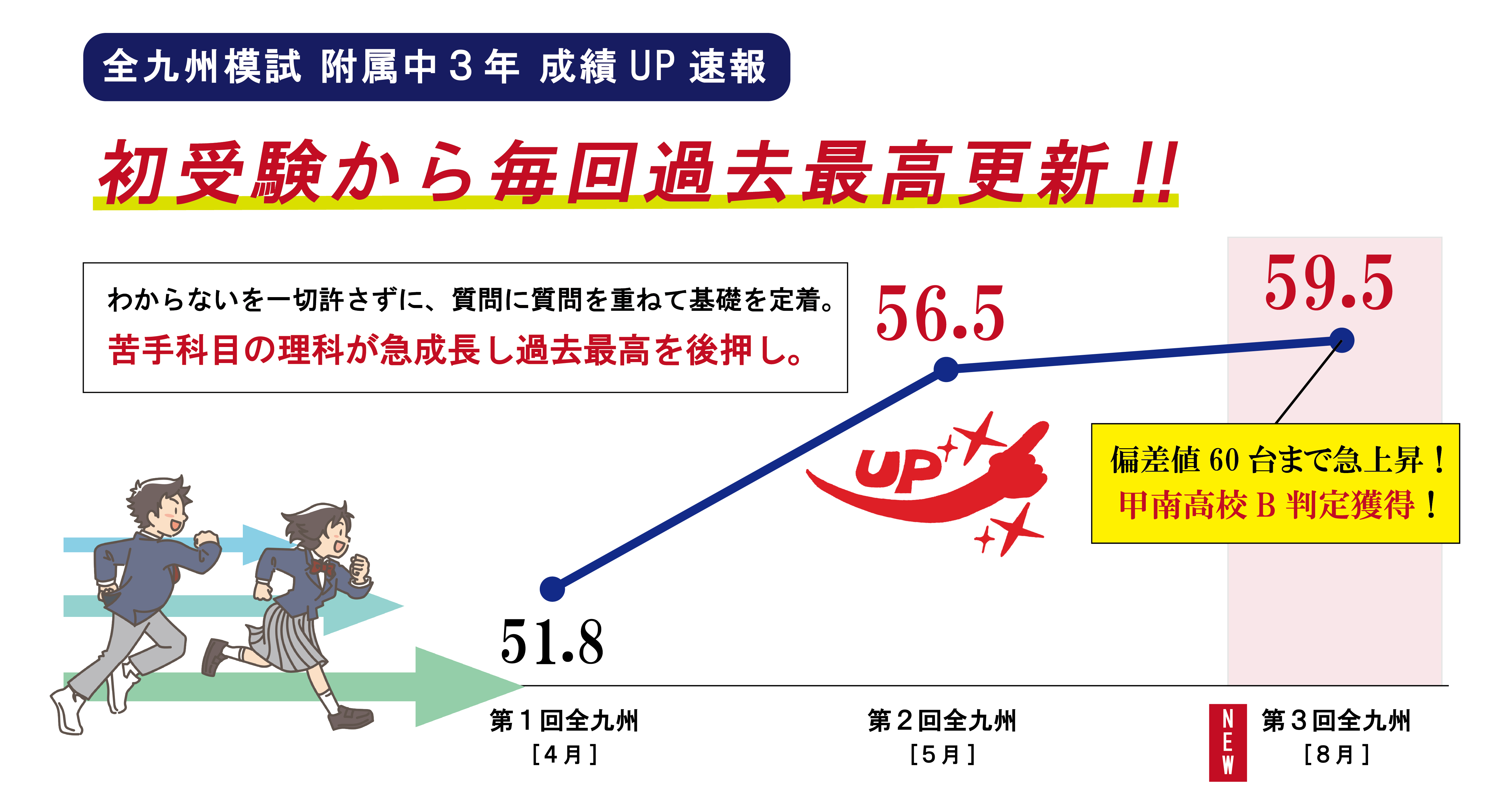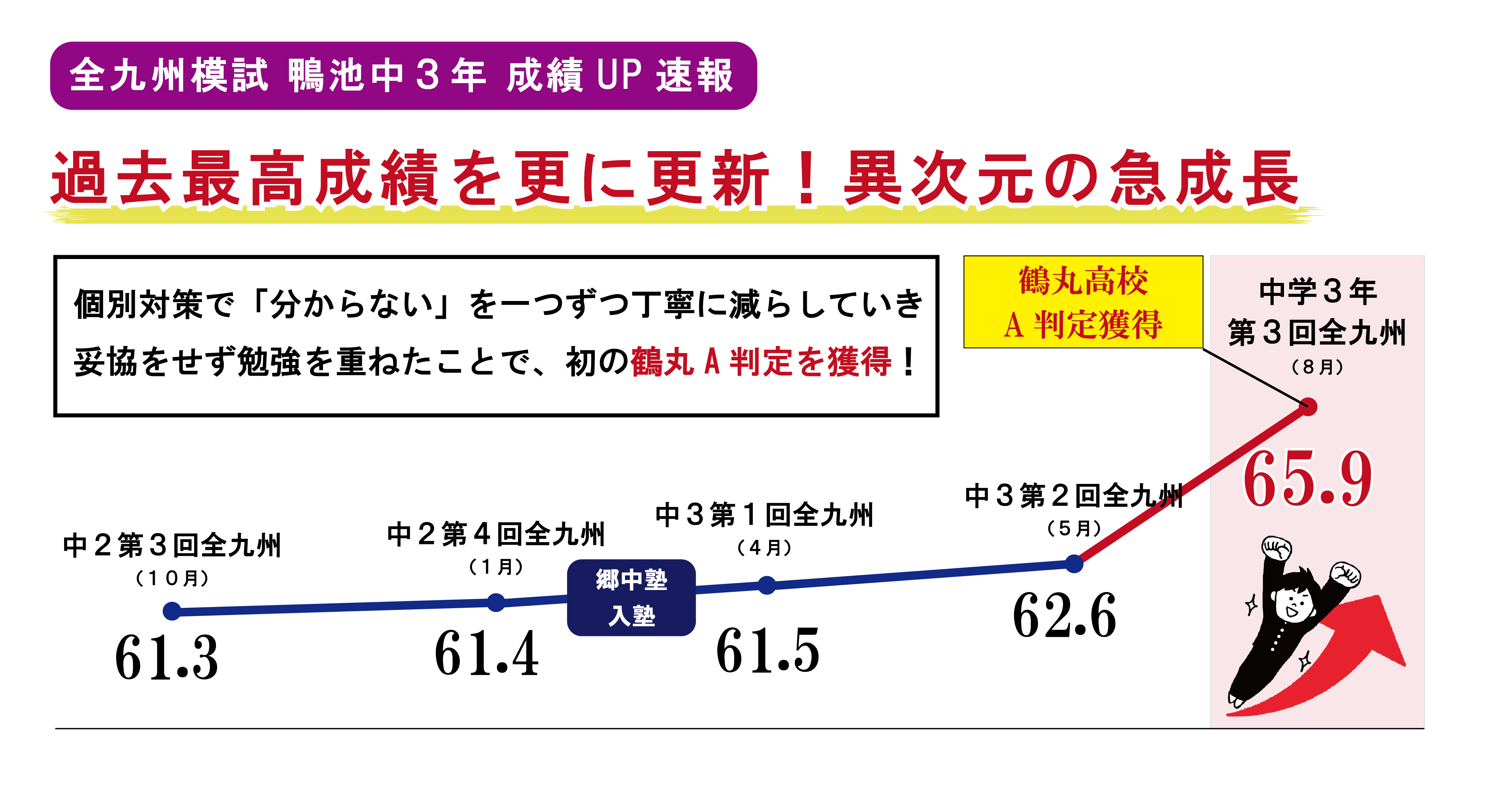 鹿児島県立高校入試に特化した学習カリキュラムを作成し、各生徒個々人にあった学習方法を用いて、合格への最短ルートで逆転合格を実現します。